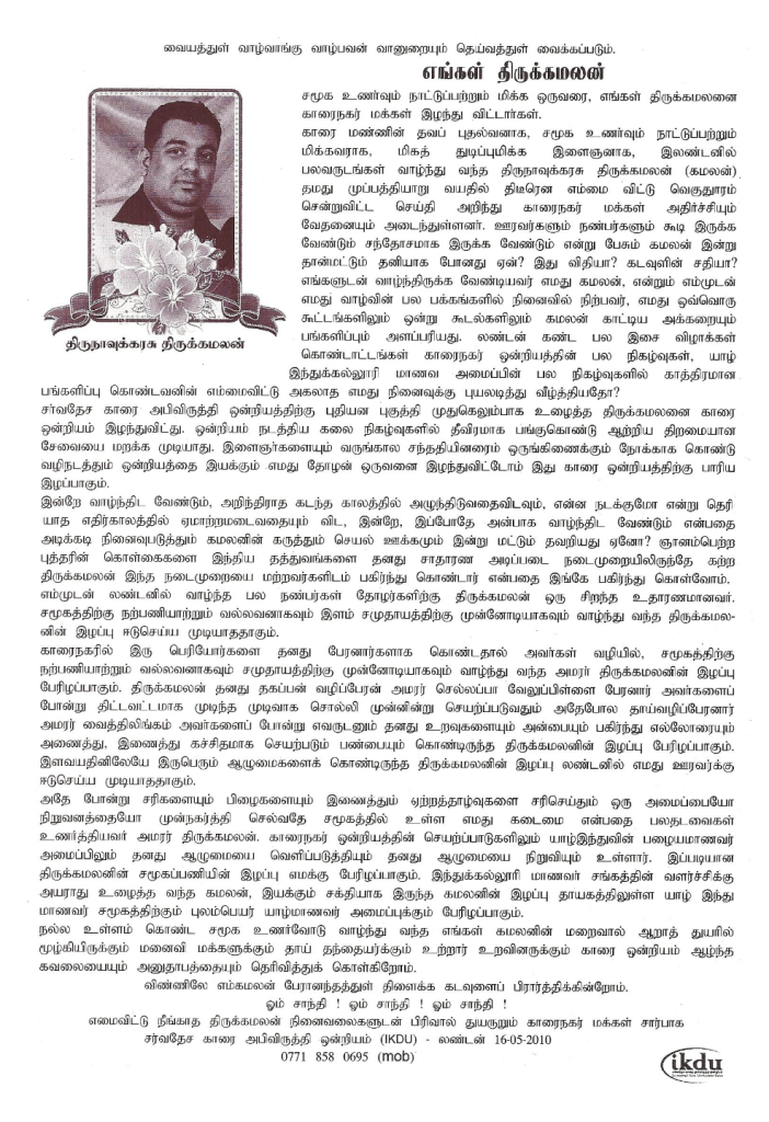 அனுப்பி வைத்துள்ள திருநாவுக்கரசு திருக்கமலன் அவர்களது மறைவு
