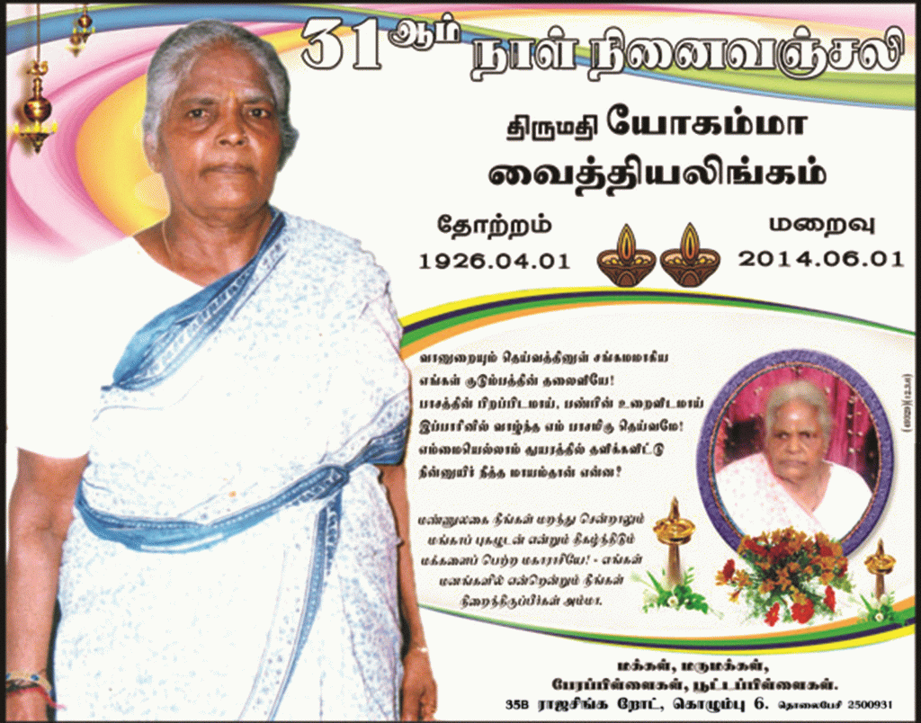 யோகம்மா வைத்தியலிங்கம் தோற்றம் 1926.04.01 மறைவு 2014.06.01