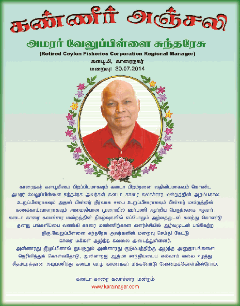 காரைநகர் களபூமியை பிறப்பிடமாகவும், கனடா Brampton  வசிப்பிடமாகவும் கொண்ட வேலுப்பிள்ளை சுந்தரேசு